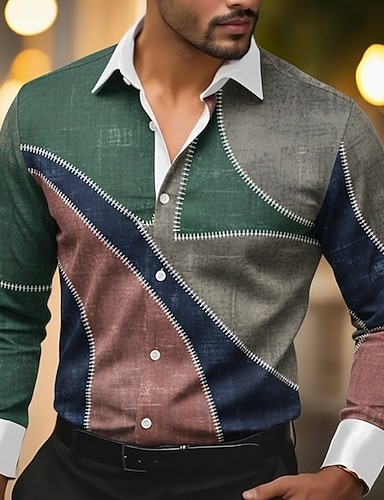 Муж. Геометрический принт Контрастных цветов Пэчворк Рубашка Атласная рубашка Длинный рукав Винтаж Ретро Отпуск На каждый день Лето Весна Осень Отложной 3D печать Рубашки на пуговицах