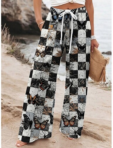 Жен. Широкие Брюки Отпуск На каждый день Длиные Завышенная В клетку Бабочка Эластичная талия Рисунок Высокий вырез Воздухопроницаемость Мягкий Слабоэластичная Отпуск Для улицы На каждый день Черный