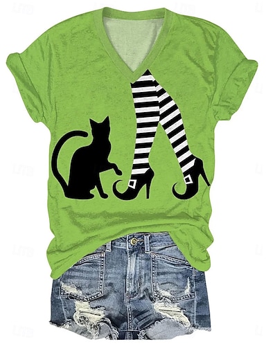 Хэллоуин Женская футболка Колдунья Графика Кот Винтажный Стиль Классическая Короткий рукав V-образный вырез Обычные топы Повседневный принт Оранжевый Зеленый Лето Весна Осень