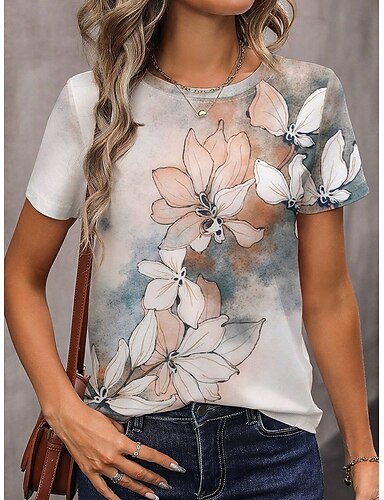 Жен. Футболка Цветочный принт Растения На каждый день С короткими рукавами Круглый вырез Обычные топы Повседневные С принтом Белый Лето Весна