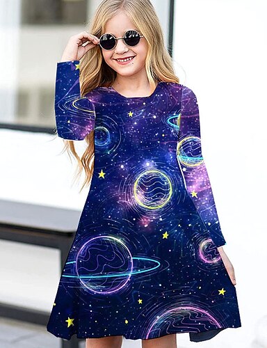 Девушки ' 3D Галактика Платье Длинный рукав 3D печать Весна Осень Отпуск Повседневные Праздники Симпатичные Стиль На каждый день Милая Дети 3-10 лет Платье в стиле 50-х годов Платье A-силуэта