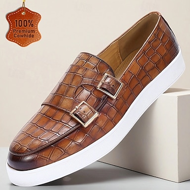 Мужские туфли из натуральной кожи с крокодиловым узором и двойной пряжкой – роскошные туфли без застежек для деловых встреч, свадеб и торжественных случаев