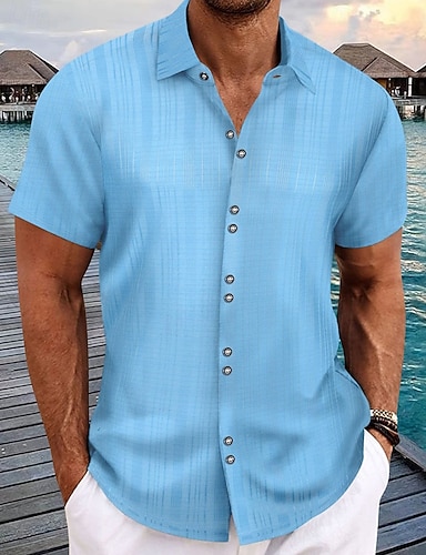 Муж. Летняя рубашка Повседневная рубашка Пляжная рубашка Кнопка рубашка Небесно-голубой С короткими рукавами В полоску Лацкан Отпуск Гавайский Кнопка вниз Одежда Полиэстер Мода На каждый день Удобный