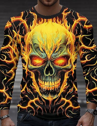 Halloween Муж. Черепа Адское пламя Футболка Длинный рукав Футболка 3D печать Вырез под горло Рубашка Мода преувеличены Для улицы Повседневные Желтый Лиловый Зеленый Лето Весна Осень Одежда S M L XL