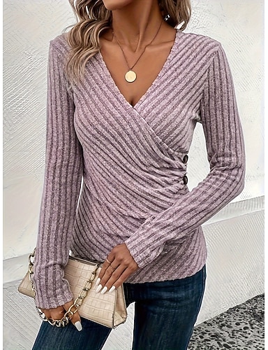 Жен. Блуза Сплошной цвет Элегантный стиль Стиль Классический Длинный рукав V-образный вырез Обычные топы Повседневные Черный Военно-зеленный Синий Лиловый Весна Осень Зима