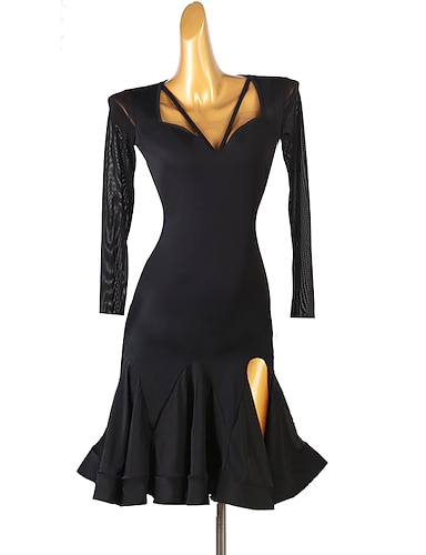 Платье для латинских танцев сальсы, однотонное женское платье для выступлений, с длинными рукавами, чинлон, сетка