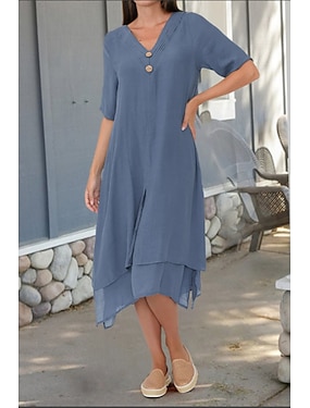 Жен. Длинное платье Платья, вдохновленные льном Повседневное платье Простое платье На каждый день Для занятий спортом Для улицы Стандартный Полотняное плетение С короткими рукавами V-образный вырез