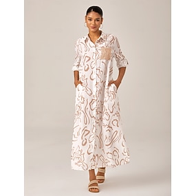 Жен. Платье-рубашка Платье с принтом Длинное платье Темно синий Абрикосовый Изгибы Карман Засучить рукава Пайетки Лето Рубашечный воротник На каждый день S M L