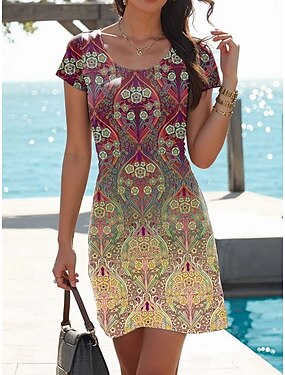 Жен. Мини-платье Платье-футболка Сарафан Платье прямого кроя Платье A-силуэта Отпуск На каждый день Богемный Для вечеринок Пляж Стандартный Цветочный принт Графика С короткими рукавами Вырез под горло
