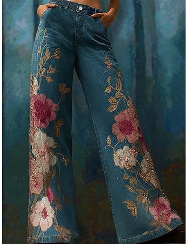 Жен. Графический Широкие Чино Отпуск Винтаж Мода Полная длина Завышенная Цветочный принт Карман Рисунок удобный Мягкий Удобный Слабоэластичная на открытом воздухе Отпуск Для улицы Синий