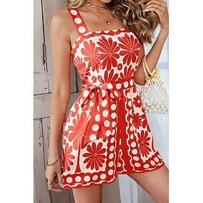 Жен. Нормальная Комбинезоны На каждый день Цветочный принт Без рукавов Квадратный вырез С принтом Отпуск Повседневные Стандартный Черный Красный Синий Лето