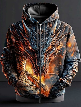 Муж. Дракон Худи Мода Круто Длинный рукав Капюшон Отпуск На выход Уличная одежда Черный Кулиска Молния Осень Зима Дизайнер