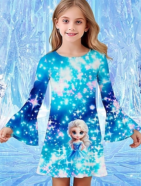 Девушки ' 3D Мультипликация В снежинку Платье Платье с рюшами Длинный рукав Лето Весна Отпуск Повседневные Праздники Красивый Милая Дети 4-12 лет Повседневное платье До колена Стандартный