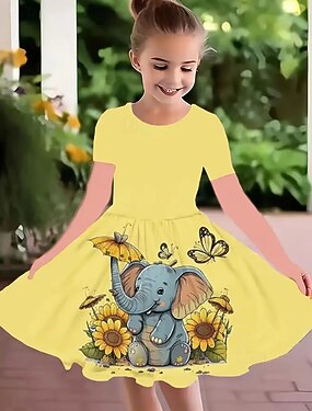 Девушки ' 3D Графика Слон Платье С короткими рукавами Лето Весна Отпуск Повседневные Праздники Принцесса Красивый Милая Дети 4-12 лет Повседневное платье Платье A-силуэта До колена Стандартный