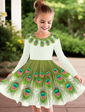 Девушки ' 3D Перья Платье Длинный рукав Лето Весна Отпуск Повседневные Праздники Принцесса Красивый Милая Дети 4-12 лет Повседневное платье Платье A-силуэта До колена Стандартный