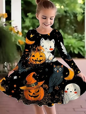 Хэллоуин Девушки ' 3D Животное Тыква Платье Длинный рукав Лето Весна Отпуск Повседневные Праздники Принцесса Красивый Милая Дети 4-12 лет Повседневное платье Платье A-силуэта До колена Стандартный