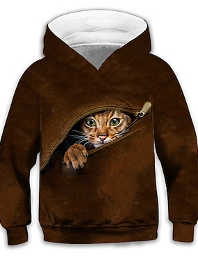Дети Мальчики Толстовка Длинный рукав Коричневый 3D печать Кот Животное Карман Повседневные В помещении на открытом воздухе Активный Мода Повседневные Спорт 3-12 лет