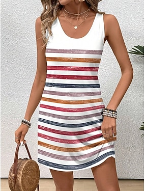 Мини-платье женское casual платье petite платье сарафан летнее платье повседневный отпуск праздник обычная посадка полоска безрукавный круглый вырез красное лето