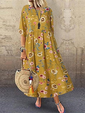 Жен. длинное платье платье макси Повседневное платье Платье в стиле 50-х годов Мода Современное Повседневные Пляж выходные Стандартный Цветы Рукав до локтя Вырез под горло
