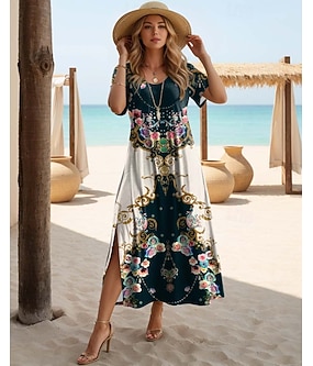 Жен. Длинное платье Повседневное платье Платье в стиле 50-х годов Платье A-силуэта Платье в стиле бохо На каждый день Повседневные Осеннее платье Стандартный Цветочный принт С короткими рукавами