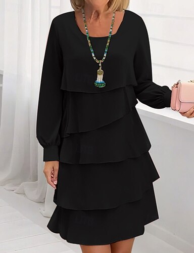 Жен. Мини-платье Черное платье Многоярусное платье Мода Современное на открытом воздухе Чаепитие На выход Стандартный Полотняное плетение Рукав 3/4 Вырез под горло Черный Весна Осень