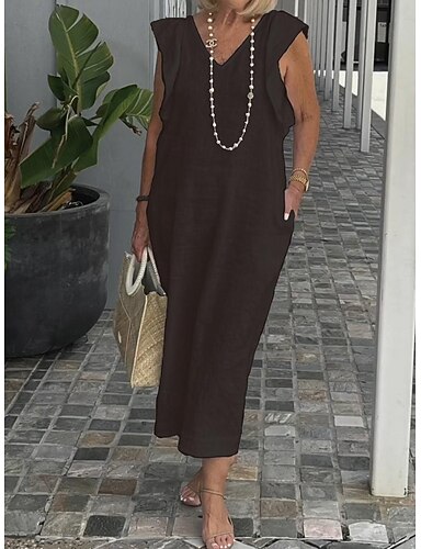 Жен. Черный Коричневый Лето Весна Длинное платье Платья из хлопка и льна Повседневное платье Платье на бретелях Классический Современное Повседневные выходные Свободное облегание Полотняное плетение