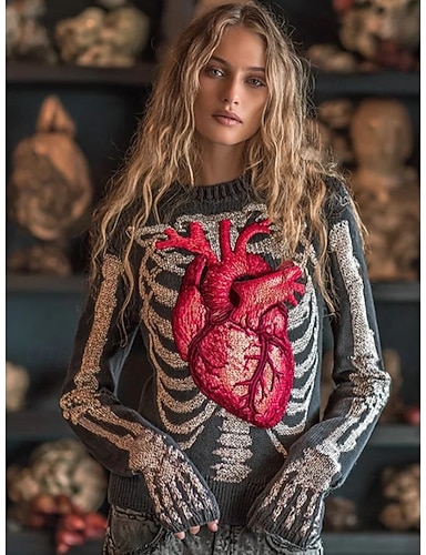 Свитер для женщин на Хэллоуин с скелетом Милый уличный стиль Повседневный графический рисунок Скелет Круглый вырез Патчворк Вязаный Длинный рукав Обычные топы Вязание черный красный Осень Зима