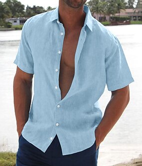 Муж. Льняная рубашка Летняя рубашка Одежда для пляжа Кнопка рубашка Рубашки навыпуск Сплошной цвет Отпуск Кьюриз Черный Белый Розовый Синий С короткими рукавами Отложной Лето Одежда Кнопка вниз
