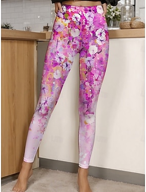 Жен. Брюки Леггинсы Уличный стиль На каждый день Полная длина Завышенная Цветочный принт Эластичная талия С принтом Воздухопроницаемость Удобный Эластичная Отпуск Для улицы На каждый день Лиловый