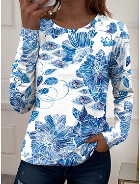 Женская футболка с длинным рукавом базовый цветочный принт длинный рукав обычные топы круглый вырез праздничный выходной белый розовый красный темно-синий синий осень и зима предосень