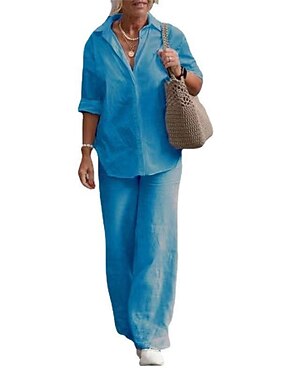 Жен. Простой На каждый день Удобная обувь Рубашка Комплекты хлопкового льна Комплекты из двух предметов Длинный рукав Длинные Пант Лацкан Чистый цвет Пуговицы Дом Для улицы Повседневные