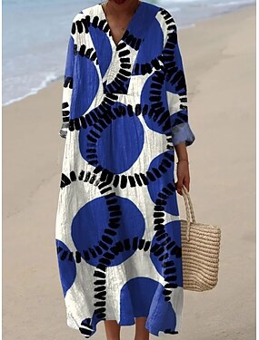 Женское миди-платье с V-образным вырезом и длинными рукавами легкий свободный крой A-силуэт повседневное платье богемный стиль для вечеринок для походов свободный крой графический геометрическая