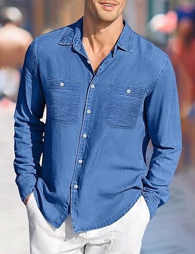 Муж. Рубашка Повседневная рубашка Джинсовая рубашка Синий Темно-синий Длинный рукав Полотняное плетение Отложной Для улицы Повседневные Передний карман Одежда Мода На каждый день Удобный