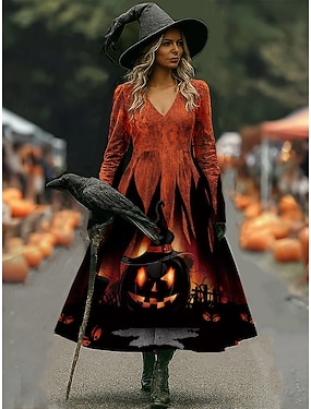 Хэллоуин Женское Платье Миди с Принтом Ведьмы Платье Формы А Праздничное Повседневное Обычная Посадка Графика Тыквы Длинный Рукав V-образный Вырез Черный Фиолетовый Оранжевый Коричневый Весна Осень
