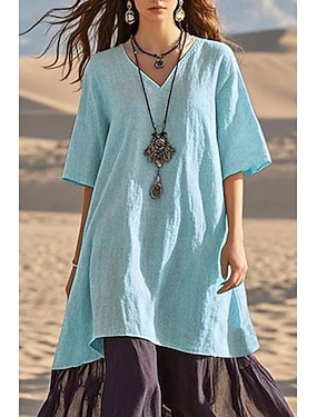 Жен. Мини-платье Платья из хлопка и льна Повседневное платье Классический На каждый день Отпуск Повседневные Стандартный Полотняное плетение Рукав 3/4 V-образный вырез Белый Синий Коричневый Серый