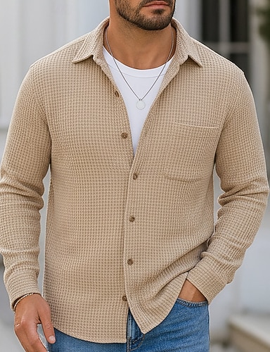Муж. Рубашка Вафельная рубашка Летняя рубашка Повседневная рубашка Кнопка рубашка Черный Бордовый Синий Зеленый Хаки Длинный рукав Полотняное плетение Текстура Лацкан Отпуск Повседневные Карман Одежда