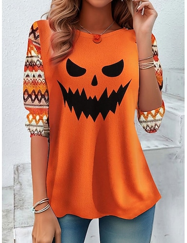 Halloween Жен. Футболка Графика Тыква Винтаж Мода Стиль Длинный рукав Вырез под горло Обычные топы Повседневные выходные С принтом Оранжевый Весна Осень Зима