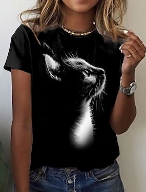 Жен. Футболка Черный Белый Синий Графика Кот С принтом С короткими рукавами Повседневные выходные Винтаж Круглый вырез Обычный 3D Кот Живопись S