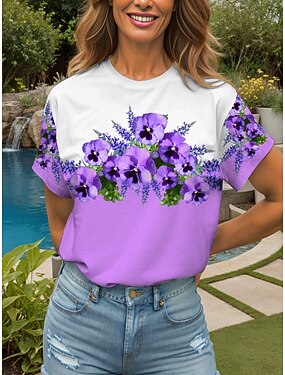 Жен. Футболка Цветочный принт Контрастных цветов 3D Стиль На каждый день С короткими рукавами Круглый вырез Обычные топы Повседневные выходные С принтом Лиловый Лето Весна