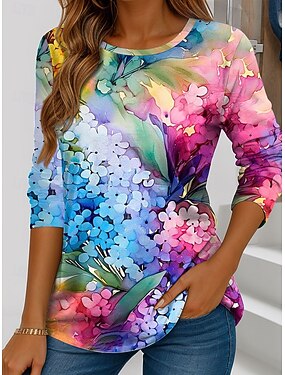 Тениска для женщин с длинным рукавом круглый вырез длинный рукав туника флористический графический узор растения элегантный винтажный стильный обычные топы ежедневная печать розовый синий фиолетовый