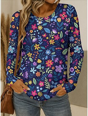 Женская футболка с круглым вырезом длинным рукавом туника цветочная графика растения винтажная стильная классическая обычные топы ежедневные принт красный синий фиолетовый коричневый зеленый осень
