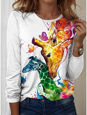 Женская футболка с круглым вырезом длинным рукавом туника графический принт животное жираф винтажный стильный современный обычные топы ежедневный уикенд принт желтый светло-коричневый синий