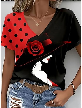 Жен. Футболка Геометрический принт Винтаж Стиль На каждый день С короткими рукавами V-образный вырез Обычные топы Повседневные Пуговицы С принтом Красный Лето Весна
