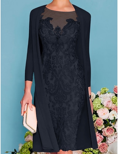 Двухсекционное платье-облегающее для пляжной свадьбы мама невесты гость на свадьбе элегантный вырез под жемчуг длина до колена шифон кружево рукава 3/4 с включённой курткой платья с бисером и