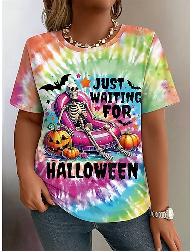 Хэллоуин Женские Топы Больших Размеров Футболка Графика Печать Короткий Рукав Круглый Вырез Повседневная Полиэстер Осень Желтый Розовый