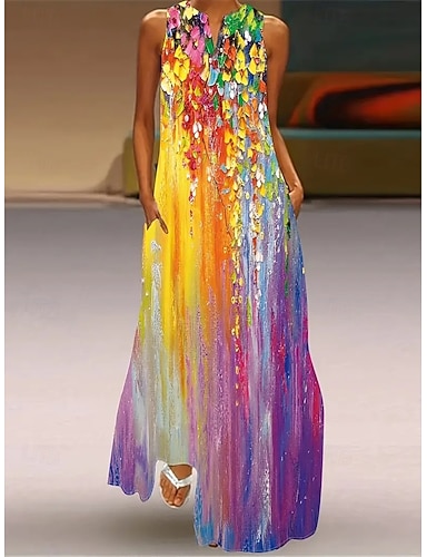 Макси-платье женское на бретельках стильное отпускное обычной посадки 3D печати цветочный цветовой блок без рукавов разрез шеи розовое синее бежевое лето