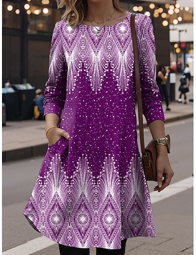 Жен. Платье средней длины Платье-футляр Платье-футболка Платье A-силуэта Спортивное платье Отпуск На каждый день Богемный Повседневные Стандартный Графика Геометрический принт Гусиная лапка
