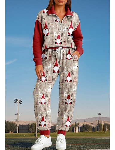 Новогодняя тематика Жен. Толстовка Спортивный костюм Спортивный костюм из двух частей Кулиска Застегнуться Геометрический принт Наборы одежды Осень Красный Назначение На открытом воздухе Путешествия