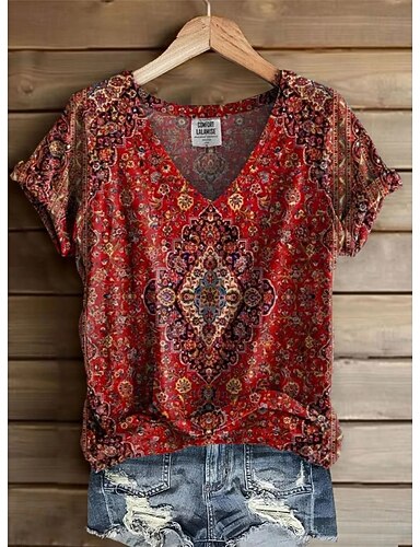 Жен. Футболка Цветочный принт Графика Огурцы Богемия Винтаж Стиль С короткими рукавами V-образный вырез Обычные топы Повседневные На выход выходные С принтом Черный Розовый Красный Синий Оранжевый