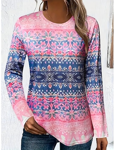 Женская футболка с длинным рукавом круглой вырез длинный рукав туника графический геометрический элегантный винтажный стильный круглой вырез обычные топы повседневный принт розовый синий фиолетовый